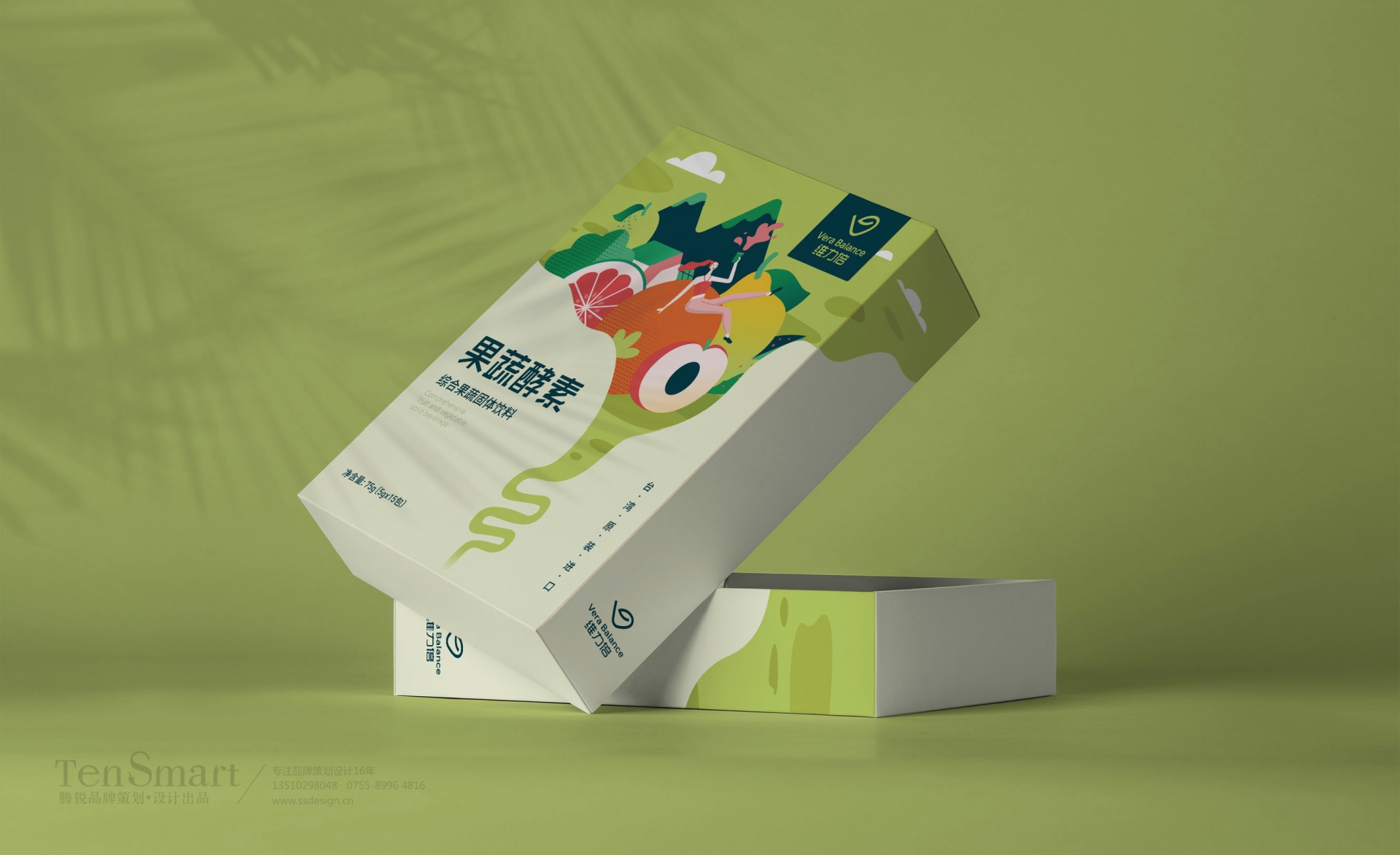 设计思路:插画场景以大自然中水和植物结合果蔬原材料,夸张趣味性的表现出产品纯天然的特征,画面中一个悠然自得、快乐且充满活力的女孩手举着酵素茶,从侧面体现出维力倍酵素带给消费者快乐、舒畅、充满活力的意象。